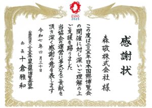 弊社は公益社団法人2025年日本国際博覧会協会より感謝状を受領しました。